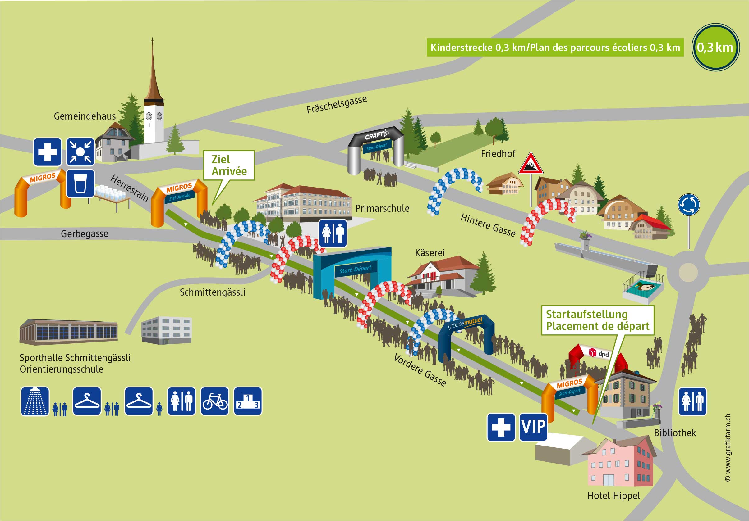 Du gelangst von der Sporthalle Schmittengässli über das Schmittengässli zum Start.