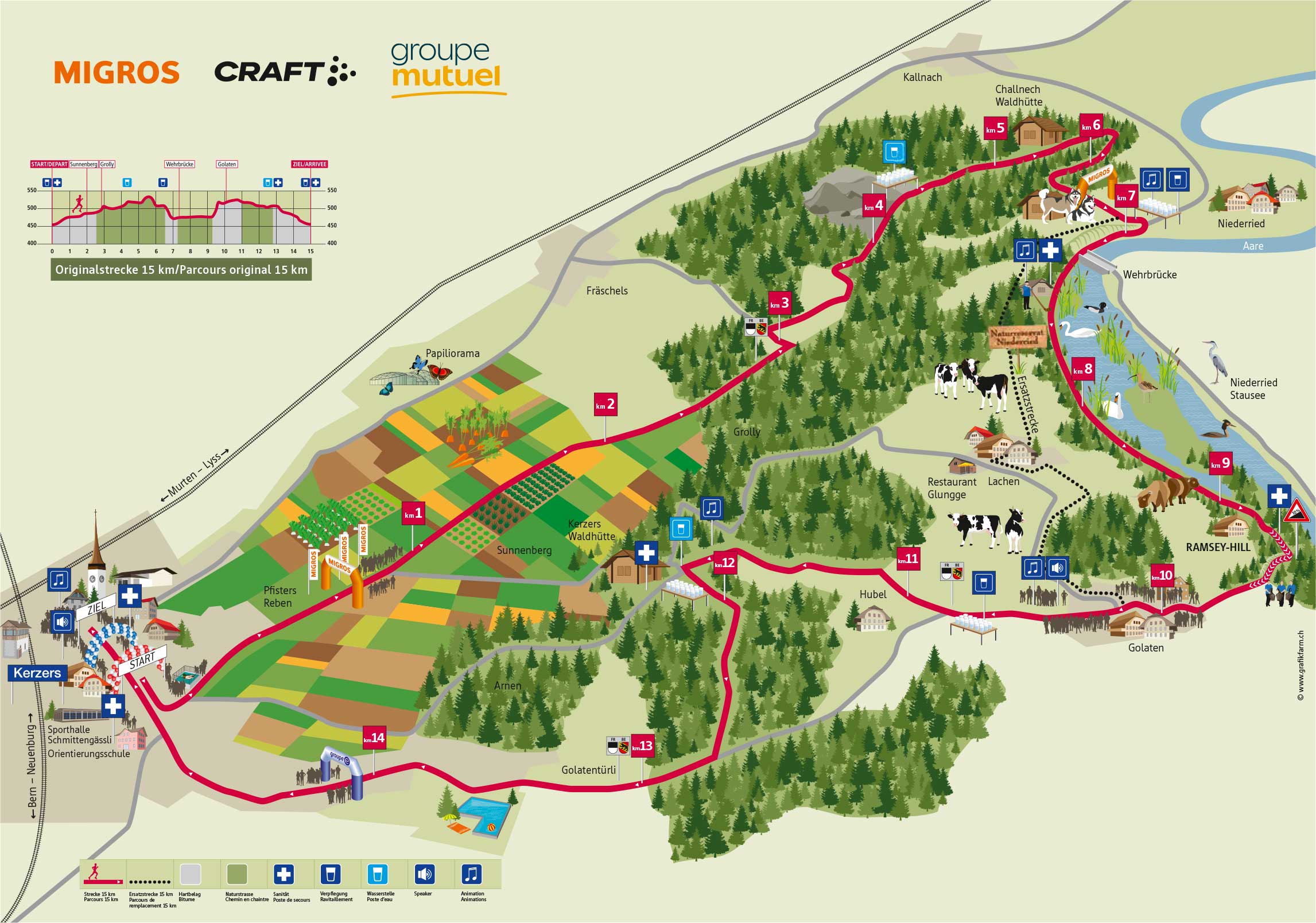 Der Klassiker über 15 km bietet eine unglaublich abwechslungsreiche und auch anspruchsvolle Strecke, die über Strassen, Feldwege, Kies, durch den Wald, am Seeufer entlang, durch ein Naturschutzgebiet, durch Kerzers und die umliegenden Dörfer führt. Diese Strecke hat einfach alles zu bieten und lässt dein Herz höher schlagen.