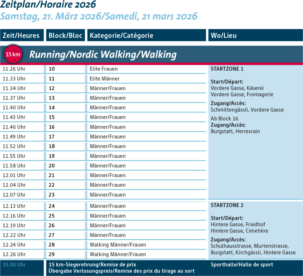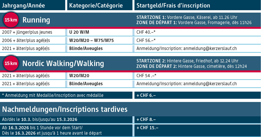 La classique sur la distance de 15 km offre un itinéraire incroyablement varié, mais aussi exigeant, qui passe par des routes, des chemins de campagne, des graviers, à travers la forêt, au bord du lac, dans une réserve naturelle, à travers Kerzers et les villages environnants. Cette route a tout simplement tout à offrir et fait battre votre cœur plus fort.